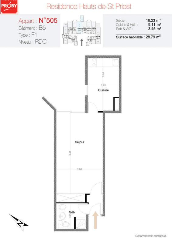F1 28 m². Cuisine indépendante équipée.