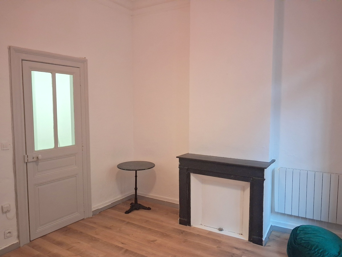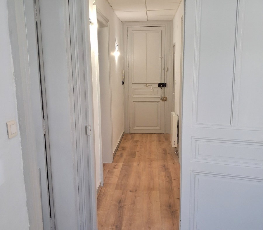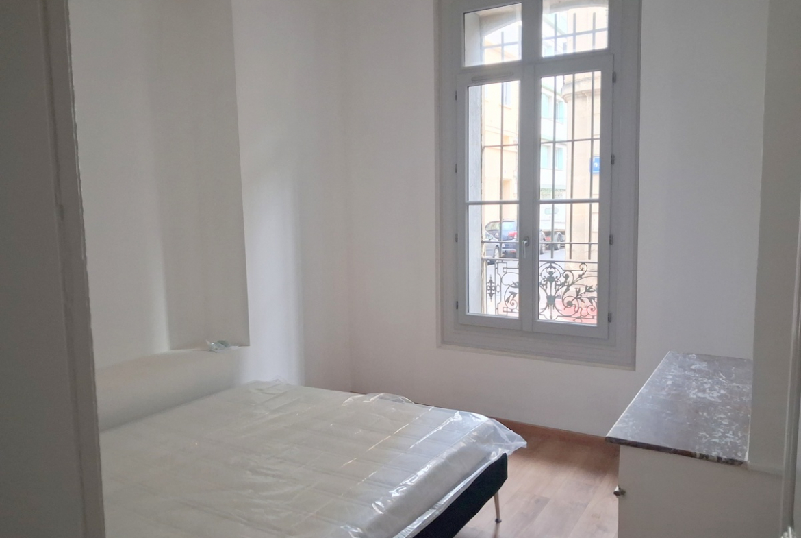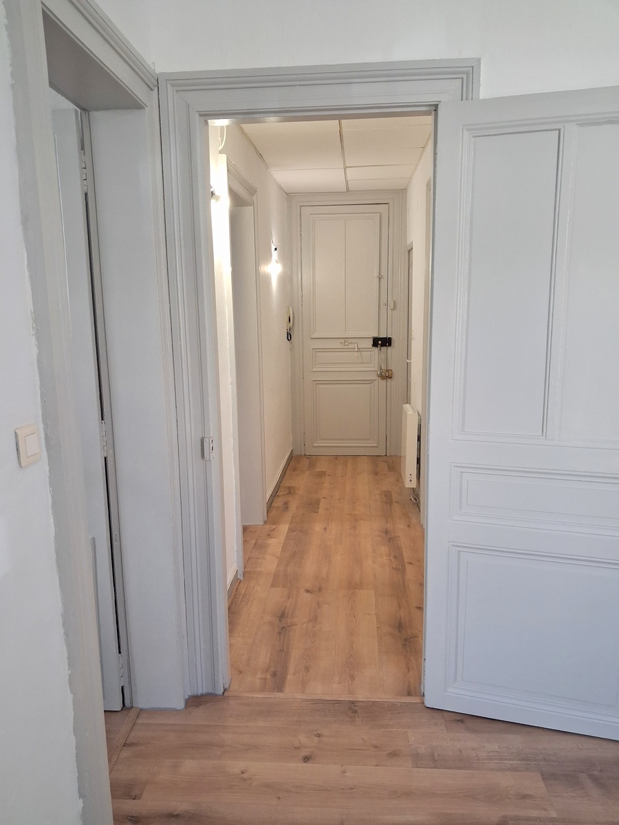 Appartement rénové comprenant 2 chambres, un séjour, une cuisine indépendante, une salle d’eau. Belle hauteur sous plafond.